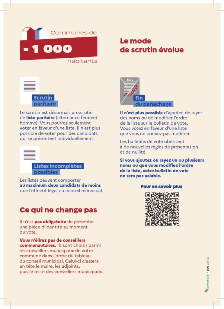 Informations / Vie de la commune Elections municipales du 15 mars 2026: nouvelles modalités de vote pour les communes de moins de 1000 habitants par mairie2 mars 20262 mars 2026 Attention: plus de panachage, sinon le bulletin sera nul