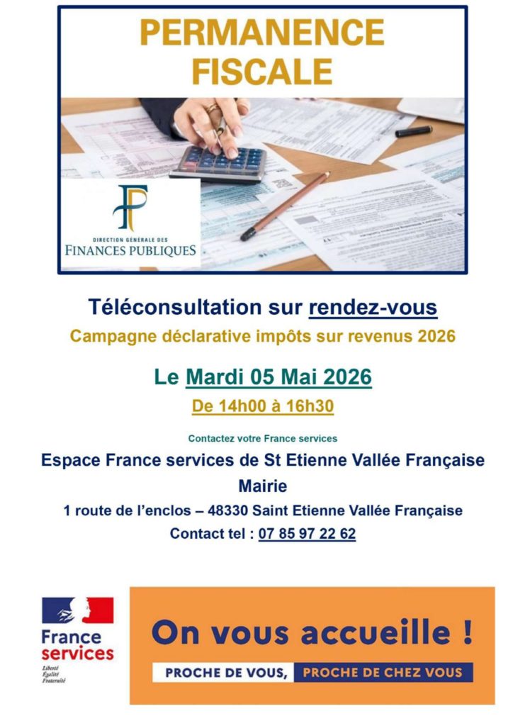 Pour cette nouvelle campagne déclarative des impôts sur les revenus 2026, les impôts organisent une permanence fiscale en téléconsultation sur rendez-vous le mardi 05 mai de 14h00 à 16h30, à France services de St Etienne Vallée Française. Pour la prise de rendez-vous, merci de contacter la France services de la Vallée Française au 07 85 97 22 62. Les créneaux sont limités, mais en fonction du nombre de demandes ne pourront essayer de solliciter une nouvelle date.